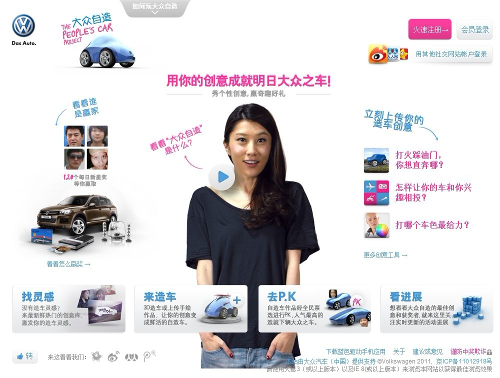負(fù)責(zé)“大眾自造”項(xiàng)目創(chuàng)意合作的天時(shí)中國公司策略總監(jiān)Devin Beringer說:這可能是汽車界第一個真正意義上的CRM項(xiàng)目。“大眾自造”充分利用了從社交媒體工具到三維建模軟件的新媒體工具,“對汽車愛好者來說,親身參與、重新定義‘大眾汽車’品牌無疑是最令人興奮的事”。