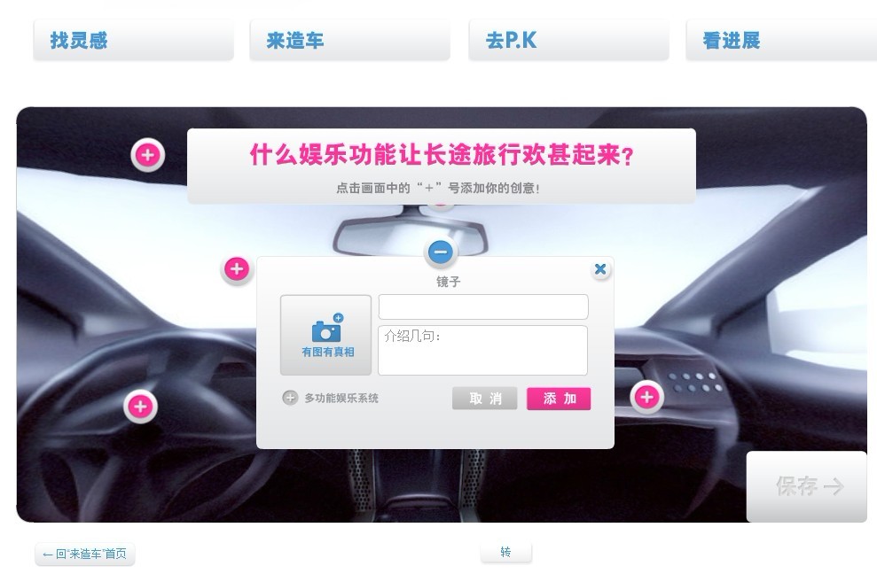 這是大眾汽車5月下旬啟動的“大眾自造”項(xiàng)目。在www.zaoche上,用戶可以直接上傳本人對汽車的創(chuàng)意、靈感、設(shè)計(jì)圖,也可以利用網(wǎng)站提供的三維建模工具,選擇心儀的車型,并用鼠標(biāo)點(diǎn)擊、拖曳,進(jìn)行空間設(shè)計(jì)、流線造型、整車上色等,設(shè)計(jì)出心儀的夢想之車。在大眾汽車設(shè)計(jì)團(tuán)隊(duì)、網(wǎng)站用戶還有名人評委的共同票選下,網(wǎng)站每天評出“每日新星獎”。