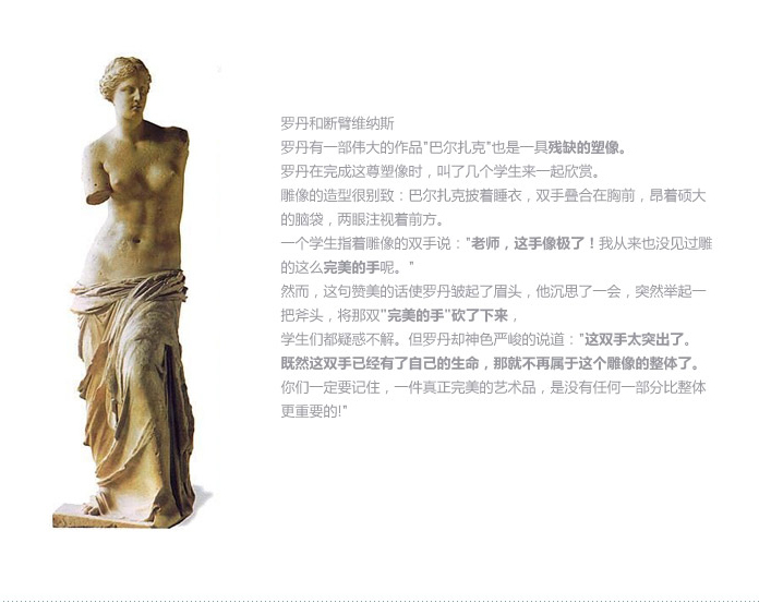 圖一:為了突出孩子,鏡頭也選了孩子的視角來表現(xiàn),去掉了武警的上半身,使主題更加突出。 圖二:帶著污泥的指尖和手里的項(xiàng)鏈足以讓人聯(lián)想到整個(gè)故事,這時(shí)沒有必要再使用完整的個(gè)體任性。排除其他因素的干擾。 圖三:臉是最容易被人關(guān)注到的人體部分,用鮮花取代了這個(gè)風(fēng)水寶地,有些風(fēng)險(xiǎn),但卻讓求婚的意圖更加突出了。 現(xiàn)在讓我們回想一下羅丹的那句話: 這雙手太突出了。既然這雙手已經(jīng)有了自己的生命,那就不再屬于這個(gè)雕像的整體了。