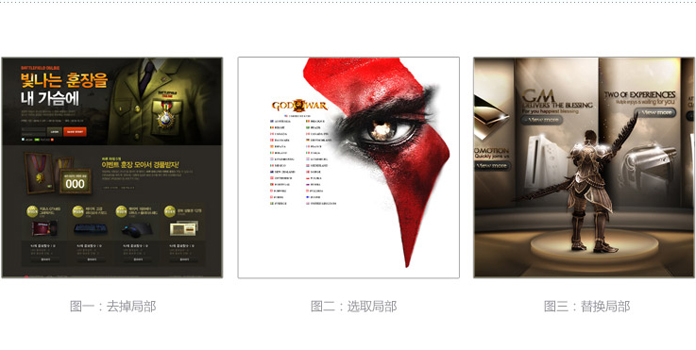圖一:去掉了將軍的頭部和下體,保留了胸章的部分,突出了榮譽(yù)。 圖二:選取戰(zhàn)神最具特征的臉部彩繪做成超大的主視覺,增加了頁面的沖擊力。 圖三:臉部依舊是最容易被人關(guān)注到的人體部分,而這里用了背臉,將人的關(guān)注度從身上移開注意到后面板塊的活動。