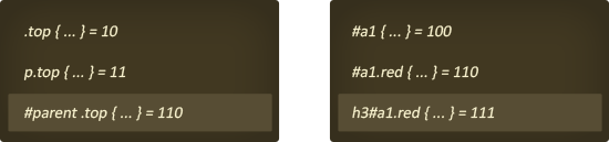 合并所有的背景圖片到一個(gè)單個(gè)圖片里面,并通過background-position屬性來使用這個(gè)圖片,這就是我們所謂的CSS Sprites的全部。 特異性 選擇器特異性 是一種用于確定當(dāng)多個(gè)規(guī)則用于同一個(gè)元素的時(shí)候哪一個(gè)起作用(優(yōu)先級)的處理方法。 通常來說,每一個(gè)CSS選擇器都有一些種類的關(guān)聯(lián)權(quán)重,某個(gè)選擇器的所有權(quán)重之和決定它在文檔中的優(yōu)先權(quán)。當(dāng)遇到很大的CSS文件時(shí),特異性就非常有幫助。