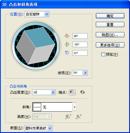 第二步:然后我們到效果>3D>凸出與斜角。設(shè)置如下: