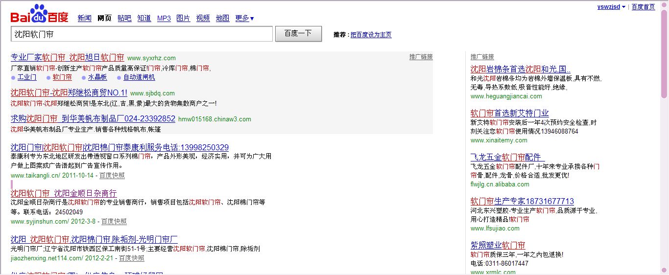 關(guān)鍵詞選擇:沈陽軟門簾 優(yōu)化效果:百度排名第一頁