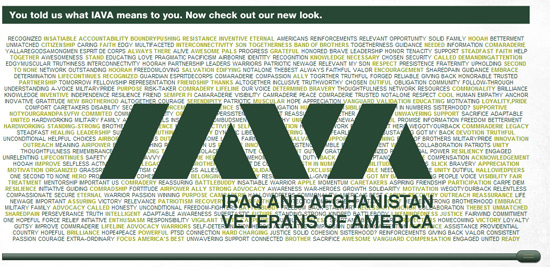 根據(jù)IAVA網(wǎng)站發(fā)布的新聞報(bào)道: “我們希望能夠捕捉到我們成員的活力,同時(shí)成為一個(gè)IAVA成員易于識(shí)別的富有光榮與驕傲的象標(biāo)符號(hào)。他們是創(chuàng)新的一代,而這個(gè)標(biāo)志反映了這一特征。該形象象征了我們一個(gè)新的社會(huì)變更,團(tuán)結(jié)美國人,并告訴國人我們是誰及代表的退伍軍人的任務(wù)。在這個(gè)國家面對(duì)這兩場戰(zhàn)爭時(shí),我們更致力于在國家層面的話語中心推運(yùn)老兵運(yùn)動(dòng),使到所有老兵及軍屬成員都能夠得到關(guān)懷及獲得應(yīng)得的支持。象Livestrong 這些為癌癥病人所設(shè)立的慈善機(jī)構(gòu)一樣,我們也同樣為這些老兵提供服務(wù)。朗濤在設(shè)計(jì)中付出了巨大的努力,他們的團(tuán)隊(duì)為其它公司豎立了一個(gè)為這些新一代老兵及軍屬服務(wù)的標(biāo)準(zhǔn)?!?/p> 在設(shè)計(jì)這個(gè)標(biāo)志前,他們通過網(wǎng)站讓那些成員以一個(gè)詞來說出他們心目中這個(gè)機(jī)構(gòu)的意義,在網(wǎng)站首頁中,背面密密麻麻的詞匯,正是這些成員在此前所提交的各種意義: