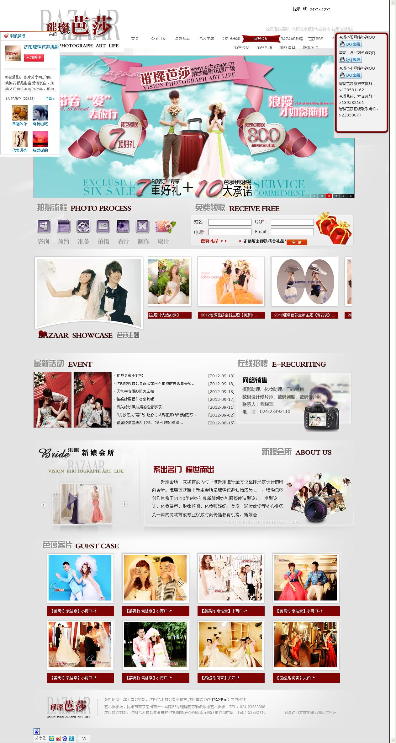 網(wǎng)站簡介: 沈陽璀璨芭莎是成立于2004年的攝影機構(gòu),憑借其卓越的服務(wù)品質(zhì)和專業(yè)的拍攝手法在沈陽婚紗攝影、沈陽藝術(shù)攝影異軍突起。芭莎人秉承著“溝通零距離,服務(wù)無止境!“的服務(wù)宗旨,用心工作,用心服務(wù)顧客。沈陽璀璨芭莎的網(wǎng)站首頁支持在線QQ、在線咨詢的功能,首頁鏈接到官方新浪微博,首頁具有圖片幻燈模式,可以鏈接到最新的優(yōu)惠活動,同樣網(wǎng)站可以通過最新活動進行發(fā)布優(yōu)惠活動和會員活動,下方滾動展示最新的主題攝影。另外網(wǎng)站支持在線預(yù)訂,可以通過網(wǎng)站進行咨詢留言,直接下訂單。