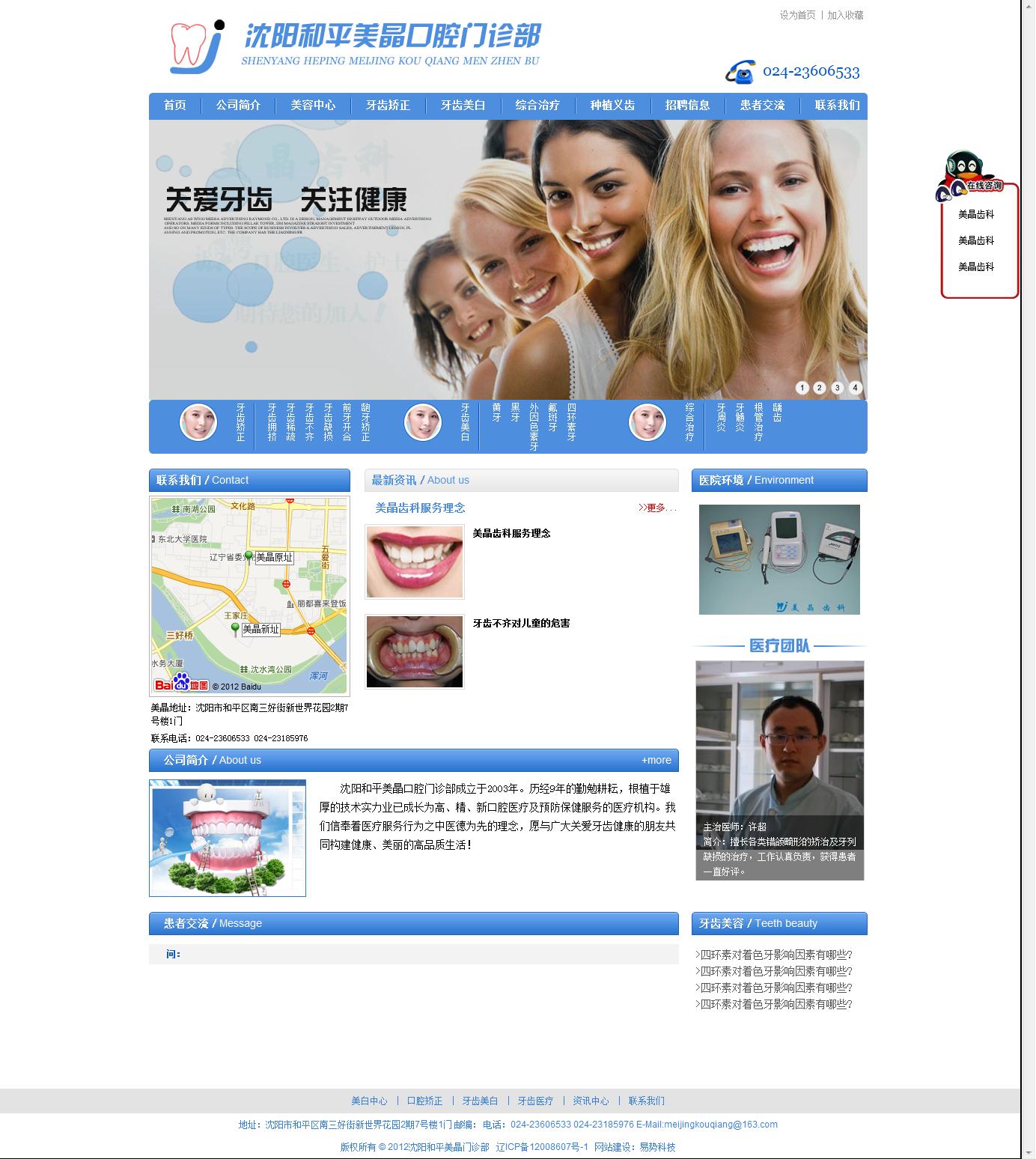 網(wǎng)站簡(jiǎn)介: 沈陽和平美晶口腔門診部成立于2003年,由畢業(yè)于中國(guó)醫(yī)科大學(xué)口腔醫(yī)學(xué)系的啜策醫(yī)師創(chuàng)立。門診擁有現(xiàn)代化的醫(yī)療器械和正規(guī)的醫(yī)技人員,用優(yōu)越的醫(yī)療技術(shù)、好的服務(wù)作風(fēng),贏得了廣大患者的認(rèn)可。沈陽和平美晶口腔門診部的網(wǎng)站有9個(gè)板塊,網(wǎng)站支持在線咨詢、留言板、網(wǎng)上招聘等功能。網(wǎng)站首頁即有在線咨詢窗口,用戶可針對(duì)口腔問題進(jìn)行咨詢,招聘信息使企業(yè)可以通過網(wǎng)站進(jìn)行公開招聘,首頁通過幻燈片方式展示了門診部的醫(yī)療團(tuán)隊(duì),讓用戶可以對(duì)公司更加了解。