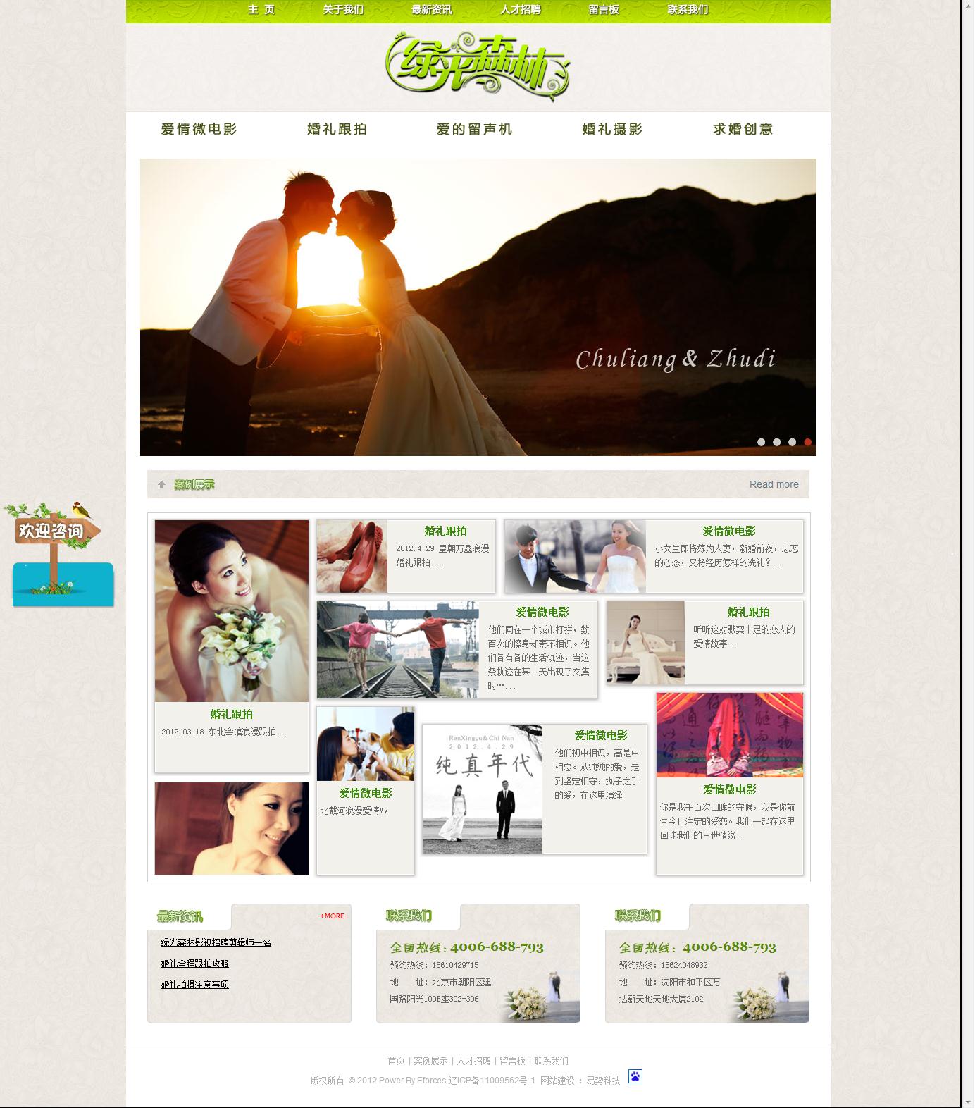 網(wǎng)站簡(jiǎn)介: 沈陽(yáng)綠光森林文化傳播有限公司用鏡頭來(lái)記錄愛(ài)情故事,屬于個(gè)人的電影工作室,服務(wù)的項(xiàng)目包括拍攝愛(ài)情微電影、婚禮跟拍、婚禮攝影、提供求婚創(chuàng)意等等。沈陽(yáng)綠光森林文化傳播有限公司有10個(gè)板塊,包括在線(xiàn)視頻、信息發(fā)布、留言板等功能。在愛(ài)情微電影、婚禮跟拍、愛(ài)的留聲機(jī)、婚禮攝影、求婚創(chuàng)意這幾個(gè)欄目中,都主要以視頻的形式展示公司成功的案例,讓瀏覽網(wǎng)站的用戶(hù)對(duì)公司的作品有更深入的了解。在瀏覽網(wǎng)站的過(guò)程中,如果遇到問(wèn)題,可以留言板上寫(xiě)下你的問(wèn)題,企業(yè)會(huì)盡快給予回復(fù),幫你解決問(wèn)題。最新資訊欄目發(fā)布該行業(yè)的相關(guān)動(dòng)態(tài),讓您對(duì)該行業(yè)的信息有所了解。
