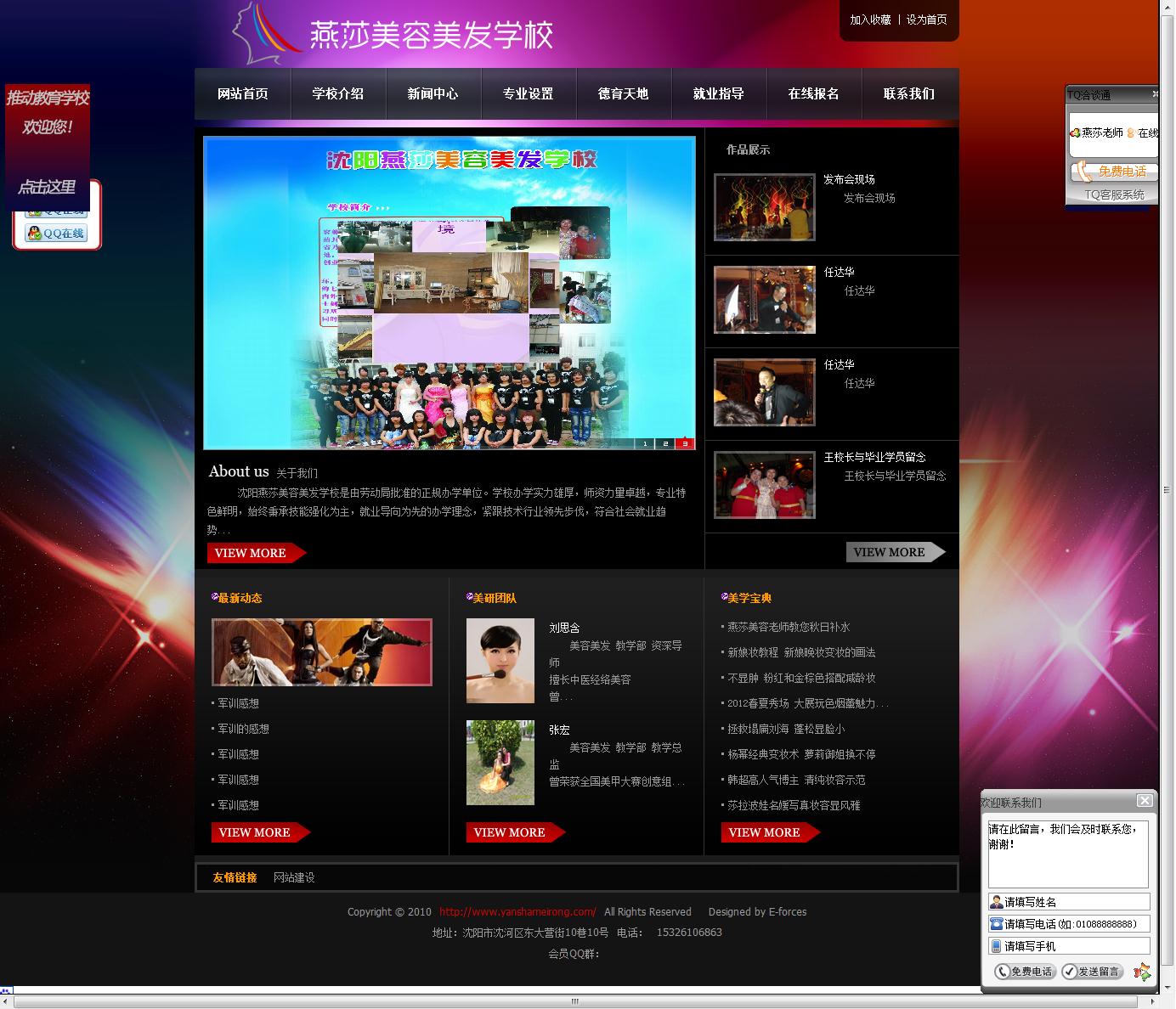 網(wǎng)站簡介: 沈陽燕莎美容美發(fā)學(xué)校是由勞動局批準(zhǔn)的正規(guī)辦學(xué)單位。學(xué)校辦學(xué)實力雄厚,師資力量卓越,專業(yè)特色鮮明,始終秉承技能強化為主,就業(yè)導(dǎo)向為先的辦學(xué)理念,緊跟技術(shù)行業(yè)領(lǐng)先步伐,符合社會就業(yè)趨勢,為國家培養(yǎng)了眾多高素質(zhì)、高技能的實用性綜合人才。沈陽燕莎美容美發(fā)學(xué)校的網(wǎng)站主要有7個板塊,支持信息發(fā)布、在線報名、作品展示等功能。網(wǎng)站首頁對美容美發(fā)學(xué)校的作品進行展示,展示的內(nèi)容包括老師的作品和學(xué)生的作品等,可以讓瀏覽網(wǎng)站的用戶了解到學(xué)校老師的水平和學(xué)員從學(xué)校中學(xué)到的內(nèi)容。學(xué)校主要通過新聞中心發(fā)布該行業(yè)相關(guān)資訊,并且用戶在瀏覽網(wǎng)站的過程中已經(jīng)決定報選的課程,可以通過在線報名進行報名。如果在瀏覽網(wǎng)站時遇到問題,可以同通過在線咨詢同企業(yè)的客服進行溝通,方便了企業(yè)同用戶之間的溝通和聯(lián)系。