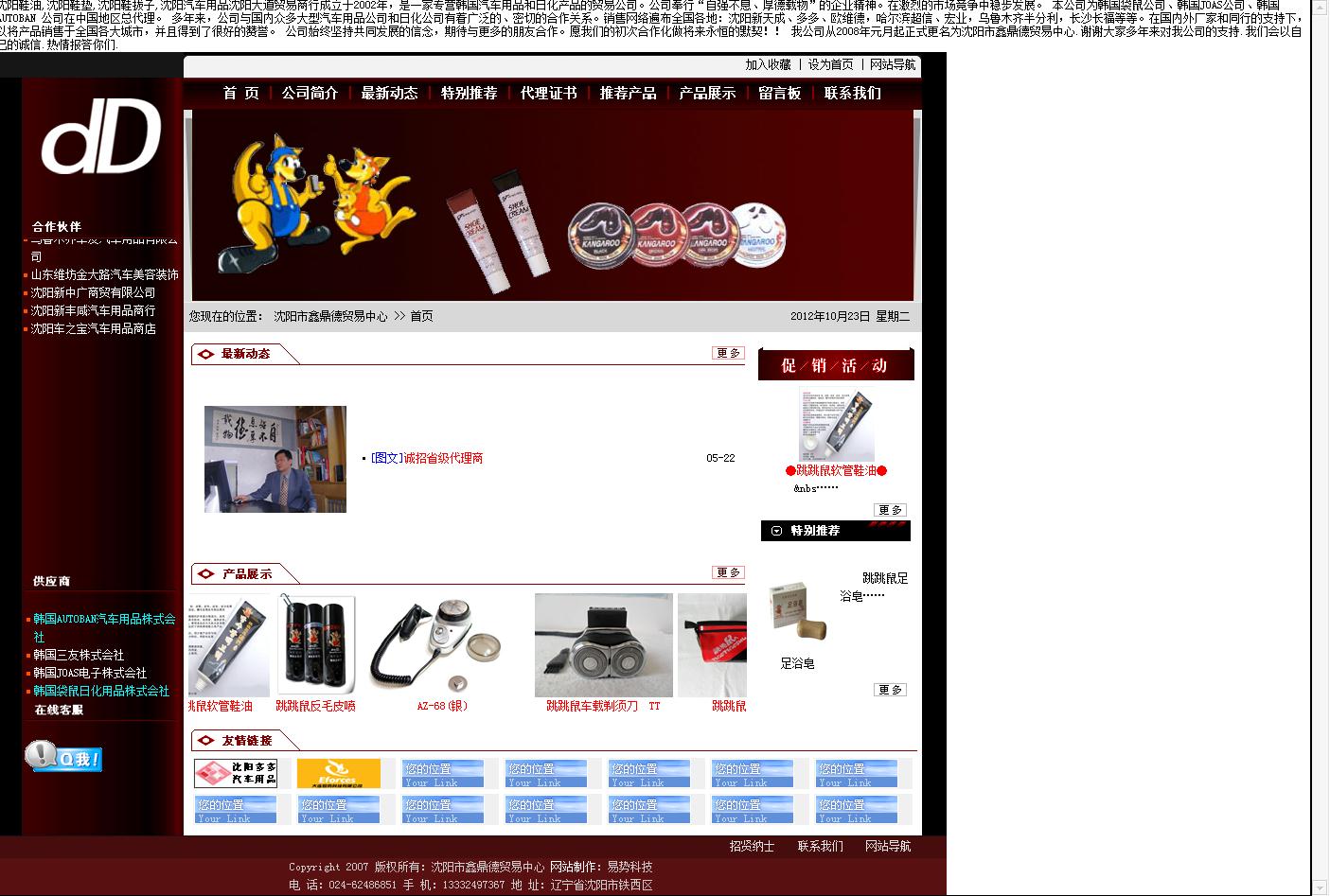 網(wǎng)站簡(jiǎn)介: 沈陽(yáng)大道貿(mào)易商行成立于2002年,是一家專營(yíng)韓國(guó)汽車用品和日化產(chǎn)品的貿(mào)易公司。公司奉行“自強(qiáng)不息、厚德載物”的企業(yè)精神。在激烈的市場(chǎng)競(jìng)爭(zhēng)中穩(wěn)步發(fā)展。公司為韓國(guó)袋鼠公司、韓國(guó)JOAS公司、韓國(guó)AUTOBAN公司在中國(guó)總代理。沈陽(yáng)大道貿(mào)易商行的網(wǎng)站主要有8個(gè)板塊,支持信息發(fā)布、產(chǎn)品展示、留言板等功能。網(wǎng)站首頁(yè)以圖片跑馬燈的方式對(duì)公司的產(chǎn)品進(jìn)行展示,這種以圖片的方式進(jìn)行展示可以讓用戶對(duì)公司的產(chǎn)品有更加直觀的了解。公司主要通過(guò)最新動(dòng)態(tài)板塊發(fā)布該行業(yè)相關(guān)信息和公司的最新動(dòng)態(tài),實(shí)現(xiàn)了信息發(fā)布功能。用戶在瀏覽網(wǎng)站的過(guò)程中,如果遇到任何問(wèn)題,可以通過(guò)留言板同企業(yè)取得聯(lián)系,企業(yè)的工作人員也會(huì)盡快回復(fù)幫助解決問(wèn)題,方便了企業(yè)同用戶之間的溝通和交流。