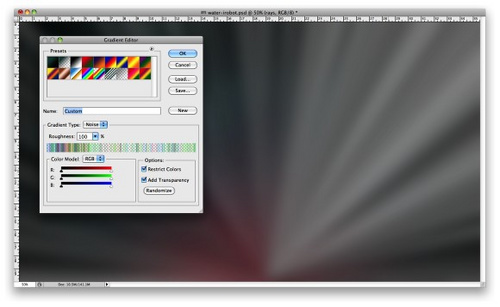 圖06 步驟7 添加另一個(gè)層,然后選擇漸變工具(G)。點(diǎn)擊漸變顏色打開漸變編輯器,然后更改類型為雜色,100%的粗糙度,選擇這兩個(gè)選項(xiàng):限制顏色和增加透明度。 使用漸變填充圖層,然后到圖像>調(diào)整>去色。之后去濾鏡>模糊>高斯模糊。我用了30像素的半徑,再次改變這個(gè)值將取決于該文件的大小。