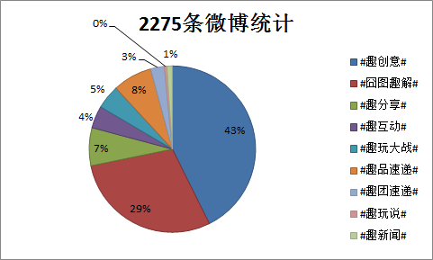 #趣創(chuàng)意#此標(biāo)簽主要收集各種有趣味性、創(chuàng)意十足的產(chǎn)品,既能符合絕大部分粉絲喜歡新鮮事務(wù)的喜好,又契合趣玩網(wǎng)的主題和特色,并且沒有廣告之嫌,能引發(fā)粉絲的主動傳播,可以說是趣玩網(wǎng)最好的微博內(nèi)容形式,因此數(shù)量多達(dá)43%也就非常合理。