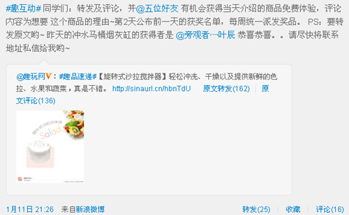 在活動上同樣如此,微博和其他網(wǎng)站上都流行送iPad或iPhone4的活動,不可否認(rèn)效果極佳,但和上面一樣,這些用戶對網(wǎng)站來說含金量太低,因此趣玩網(wǎng)前期活動以送網(wǎng)站新品為主,一舉四得就不再次重復(fù)了。后期也是送國外創(chuàng)意產(chǎn)品,除了效果更佳外,還有進(jìn)行前期市場調(diào)查的作用,通過反響來決定是否引進(jìn)。