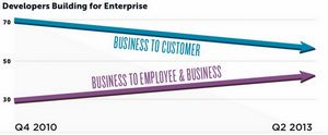 JavaScript有很強(qiáng)的實(shí)力,且具有靈活性和普遍性。早期使用JavaScript的企業(yè)現(xiàn)在已經(jīng)準(zhǔn)備好將Web開發(fā)者轉(zhuǎn)型成移動(dòng)開發(fā)者,借力把他們所擁有的JavaScript的技巧應(yīng)用在這些新的領(lǐng)域。同樣的,傳統(tǒng)的企業(yè)App服務(wù)端開發(fā)者正在將他們的專業(yè)知識(shí)應(yīng)用到JavaScript上來(lái),與此同時(shí),他們也發(fā)現(xiàn)將專業(yè)知識(shí)和JavaScript相結(jié)合要比和Java/C#語(yǔ)言結(jié)合來(lái)的更容易。
